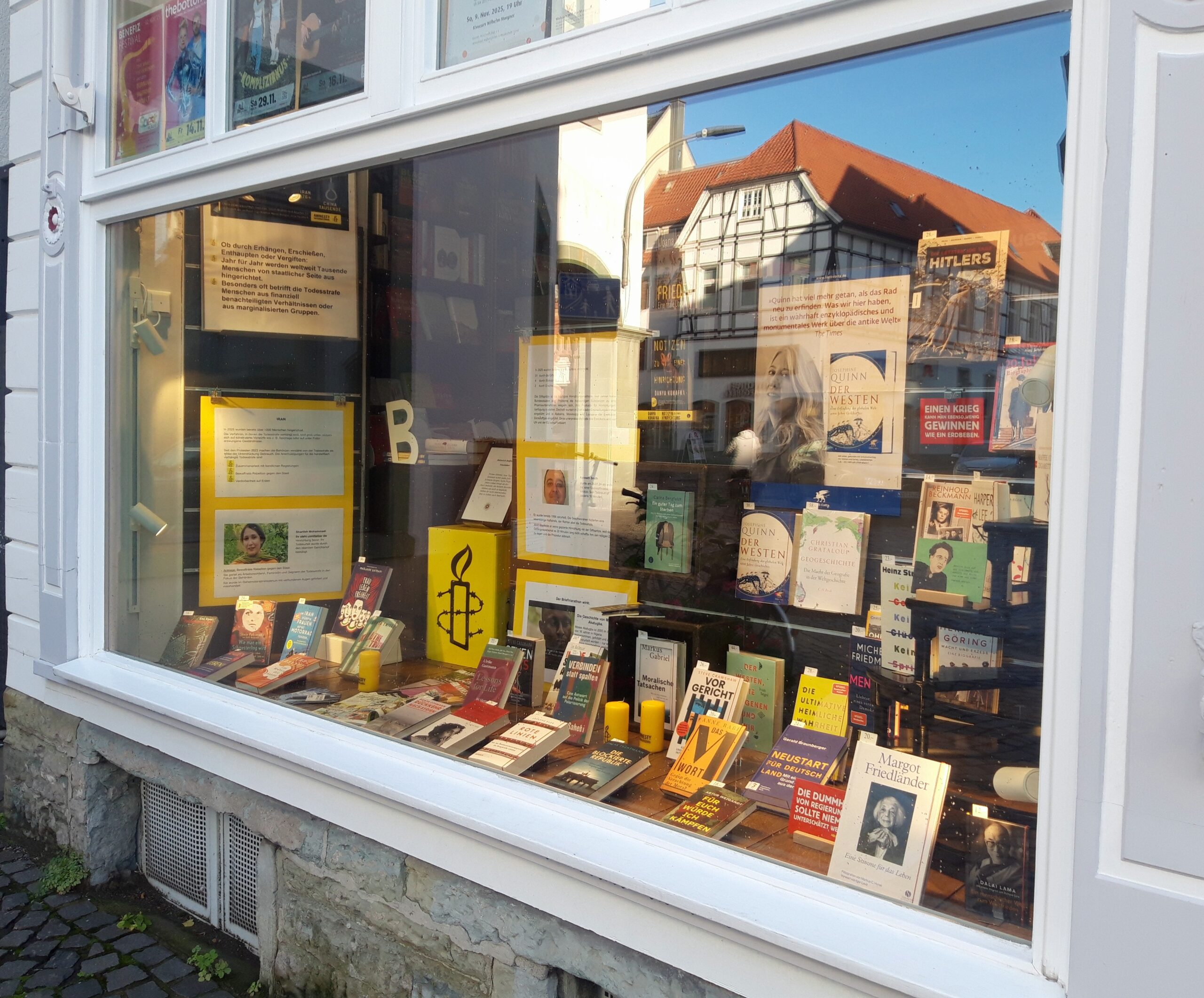 Unübersehbar: In einem Schaufenster der Ritterschen Buchhandlung am Grandweg stehen in diesen Tagen die Menschenrechte im Blickpunkt. Jedes Jahr gibt die Soester Traditionsbuchhandlung Amnesty International die Möglichkeit, ein Menschenrechtsthema in den Fokus zu rücken. Diesmal geht es um den Kampf gegen die Tötung durch den Staat, einem der Grundanliegen der Arbeit von AI.